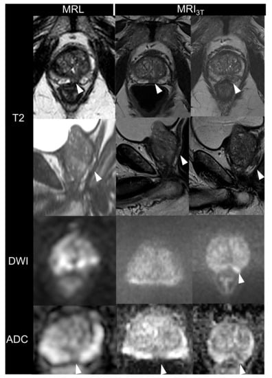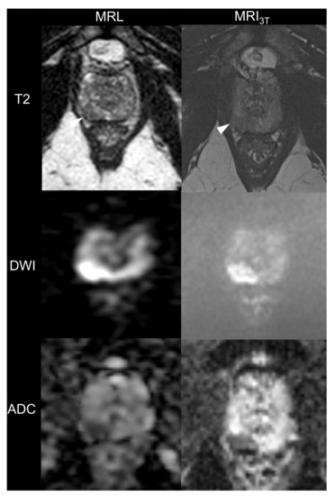 Illustration of T2-weighted axial (first row), coronal (second row) and sagittal (third row) images acquired using MR-Linac (MRL) at 1.5 T and corresponding images recorded on a standard MRI at 3 T (MRI3T) of the same 73-year-old male as in Figure 2. Diffusion-weighted images (DWI) and apparent diffusion coefficient (ADC) maps are depicted. The cancerous lesion on the apical posterior-medial aspect of the left peripheral zone is shown on the axial and sagittal images (arrows).