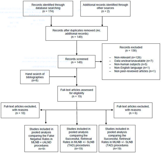 There have been numerous studies, with varying results, that have investigated the role of MLNB and TAD in this context [13,14,15,16,17,18,19,20,21,22,23,24,25,26,27,28,29,30,31]. The aim of this study was to evaluate the FNR of MLNB alone and combined with SLNB (TAD) by pooling the data from the relevant studies.