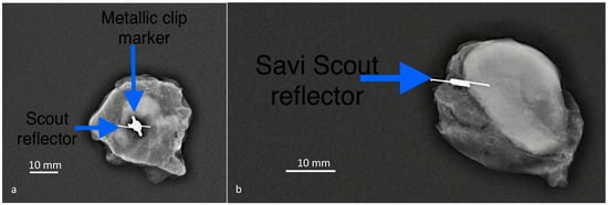 Figure 2. In (a), the patient had a metallic marker clip deployed within the pathological lymph node at the time of biopsy before neoadjuvant chemotherapy (NACT) and a second localization procedure using Savi Scout prior to surgery. In (right), the patient had the Savi Scout reflector at the time of biopsy prior to NACT thus avoiding a second procedure. There were no MRI artifacts related to the Savi Scout reflector in (b). The surgical procedure of identification and retrieval of the Savi Scout reflector took 15 min. Scale bar: 10 mm.