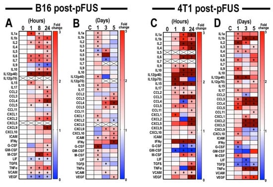 B16 and 4T1 tumors were harvested at 1, 8, or 24 h following pFUS (n = 12 tumors/time point) and CCTF and CAM at each time point were measured and compared to sham controls (0 h, n = 12 for both tumors). Heat maps of CCTF and CAM expression revealed similarities and differences between pFUS-treated B16 (Figure 2A) and 4T1 tumors compared to sham controls (Figure 2C) (Figures S1 and S3 for raw data). Within the first 24 h post-sonication, there was ~75% (25 of 33) concordance for CCTF and CAM between the B16 and 4T1 tumors with significantly (p < 0.05, ANOVA) increased expression profiles consistent with a shift towards anti-tumor (‘hot’) TIME. In both tumor types pFUS increased IL1α, IL1ß, IL2, IL6, IL12p40, IL15, IL17, TNFα, and VCAM. However, there were also significant increases in IL4, IL10, macrophage colony stimulating factor (M-CSF), CCL3, CCL4, CXCL2, and CCL11. Moreover, IL9, leukemia inducible factor (LIF), IFNγ, CCL11, CCL2, CXCL10, VEGF, and TGFβ were unchanged or significantly decreased in B16 tumors. Decreased expression of granulocyte-CSF (G-CSF) and granulocyte macrophage-CSF (GM-CSF) was observed in 4T1 tumors. Other differences include undetected CXCL5 and IL12p70 in the B16 that were present in 4T1 tumors or undetected IL5 and IL7 in the 4T1 that were upregulated in the B16 tumors.