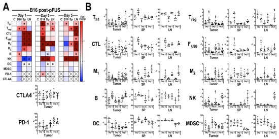 Immune cell profiling following pFUS in B16 tumors. (A) Heat map of flow cytometry analysis (n = 6 mice/time point) for B16 tumor (B16), spleen (Sp) or lymph node (LN) compared to time-matched control tissues. Tissues were harvested 1 (left), 3 (middle), or 5 (right) days following pFUS; Increased fold changes are indicated in red while decreased fold changes are shown in blue. Fold change > 3.1 is displayed as dark red; (B) Quantitative values of immune cell profiles (mean ± SD) of mouse B16 tumor, Sp, or LN, dissected 1, 3, or 5 days following pFUS. y-axis represents the relationship between each cell population to the total cells detected; x-axis represents days post-pFUS. Asterisks indicate statistical significance (p < 0.05; ANOVA) between total cells detected in pFUS-treated mice (black squares) samples to time-matched controls (black circles). Helper T cells (Th1), cytotoxic T lymphocytes (CTL), regulatory T cells (Treg), natural killer (NK) cells, dendritic cells (DC), F4/80 macrophages (M1 and M2), myeloid-derived suppressor cells (MDSC), cytotoxic T-lymphocyte antigen 4 (CTLA4), programmed death-1 (PD-1) and programmed death-ligand 1 (PD-L1).