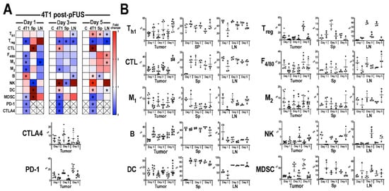 Immune cell profiling following pFUS in 4T1 tumors. (A) Heat map of flow cytometry analysis (n = 6 mice/time point) results for 4T1 tumor (4T1), spleen (Sp) or lymph node (LN) compared to time-matched control tissues. Tissues were harvested 1 (left), 3 (middle) or 5 (right) days following pFUS; Increased fold changes are indicated in red while decreased fold changes are shown in blue. Fold change > 3.1 is displayed as dark red; (B) Quantitative values of immune cell profiles (mean ± SD) of mouse 4T1, Sp, or LN, right, dissected 1, 3 or 5 days following pFUS. y-axis represents the relationship between each cell population to the total cells detected; x-axis represents days post-pFUS. Asterisks indicate statistical significance (p < 0.05; ANOVA) between total cells detected in pFUS-treated mice (black squares) samples to time-matched controls (black circles). Helper T cells (Th1), cytotoxic T lymphocytes (CTL), regulatory T cells (Treg), natural killer (NK) cells, dendritic cells (DC), F4/80 macrophages (M1 and M2), myeloid-derived suppressor cells (MDSC), cytotoxic T-lymphocyte antigen 4 (CTLA4), programmed death-1 (PD-1), and programmed death-ligand 1 (PD-L1).