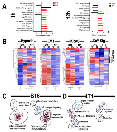 (A) Gene ontology (GO) categories of top significantly enrichment obtained from B16 (red bars) and 4T1 (black bars) flank tumors 1 (left) or 12 (right) h following pFUS treatment compared to un-sonicated controls. Log2 fold change for each gene is shown in its respective bar. (B) Hierarchical clustering of gene expression signature associated with hypoxia, KRAS signaling, epithelial to mesenchymal transition (EMT), and Ca2+ signaling. GO of biological processes gene sets for B16 (C) or 4T1 (D) tumors 1 (left) or 12 (right) h post-pFUS compared to un-sonicated controls. (n = 5 mice/tumor type/time point).
