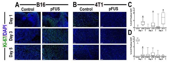 Representative images of Ki-67 localization within sectioned (A) B16 melanoma or (B) 4T1 breast flank tumor sections 1 (top), 3 (middle), or 5 (bottom) days following pFUS treatment (right) or untreated control tumors (left) (n = 6 sections/tumor type/time point). Quantitative analysis of Ki-67 localization within (C) B16 tumors or (D) 4T1 tumor area. The upper and lower bounds of the boxplots denote the 25th and 75th percentiles, while the midlines indicating the mean values. Whiskers indicate values outside the upper/lower quartile and within standard deviations. Asterisks indicate statistical significance (p < 0.05; unpaired t-test) between tumor-bearing mice treated with pFUS to time-matched untreated controls. (scale 100 µm).