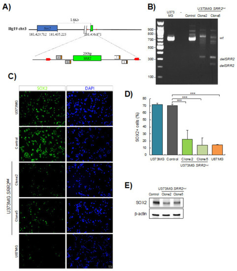 Thus, in the present study, we used CRISPR/Cas9 technology to delete SRR2 in GBM cells. We observed a reduction of SOX2 expression, which is accompanied by impairment of proliferative activity and reduction of self-renewal capacity in vitro. Additionally, SRR2-deleted cells lose the capacity to form tumors in vivo. These effects correlated with an elevation of the p21CIP1 and p27KIP1 cell cycle and quiescence regulators. These results show that SRR2 is required for SOX2-driven oncogenic activity in GBM cells.