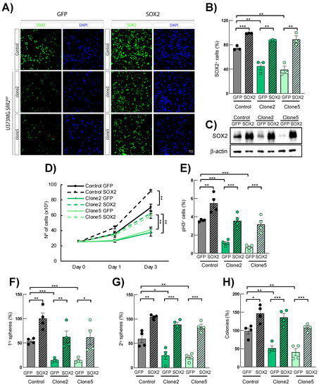 To further determine whether deletion of SRR2 is necessary for SOX2 expression and oncogenic activity, we next tested whether SOX2 re-activation could restore the impaired phenotypes described in SRR2del cells. Immunofluorescence and Western blotting showed a significant increase in the number of SOX2-positive cells and expression levels in SOX2 control cells, as well as restoration of SOX2 in clone2 and clone5 cells infected with ectopic SOX2 (Figure 4A–C). As expected and previously described [15], forced expression of SOX2 significantly increased proliferation and stem cell properties in control U373MG cells (Figure 4D–H). Interestingly, clone2 and clone5 cells with ectopic expression of SOX2 also showed higher cell growth and a larger number of pH3+ cells compared to their respective controls (Figure 4D,E). Similarly, the ability to form primary and secondary oncospheres was increased in clone2 and clone5 cells with SOX2 restoration, reaching the numbers of control cells (Figure 4F,G) In agreement with this, clone2 and clone5 cells with SOX2 restoration displayed larger and bigger spheres (Figure S2), as well as increased capability to form colonies at low density compared to their respective controls (Figure 4H). These results show that ectopic expression of SOX2 rescues several phenotypes of SRR2del cells, indicating that the expression and the oncogenic activity of SOX2 is, at least in part, mediated by the SRR2 regulatory region.