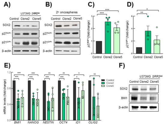 SRR2-deleted cells show higher p21CIP1 and p27KIP1 levels. (A) Representative immunoblots of SOX2, p27KIP1 and p21CIP1 in U373MG control, SRR2del clone2 and clone5 cells. (B) Representative immunoblots of SOX2, p27KIP1 and p21CIP1 in secondary oncospheres derived from control, clone2 and clone5 cultured in stem cell conditions, References should be cited in numerical order. Please just confirm that all refs are correctly cited, then we will rearrange the order after proofreading. (C,D) mRNA expression levels of p27KIP and p21CIP1 by RT-qPCR in clone2 and clone5 referring to control (n = 4). (E) mRNA expression levels of BMI1, NANOG, NESTIN, OCT4, ID1 and OLIG2 by RT-qPCR in clone2 and clone5 referring to control (n = 4). (F) Representative immunoblots of SOX2 and BMI1 in control, clone2 and clone5 cells. The statistical significance was assessed with the Student’s t-test (* p < 0.05, ** p < 0.01 and *** p < 0.001).
