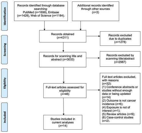 We identified 3033 records by searching PubMed, Embase, and web of science after removing the duplicates (Figure 1). We identified 46 articles that needed further full-text review, of which 32 articles were excluded (Table S2). Finally, we included 15,890 liver cancer cases from 14 prospective studies in the current meta-analysis [6,7,8,11,12,20,21,22,23,24,25,26,27,28] (Table 1).
