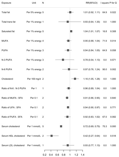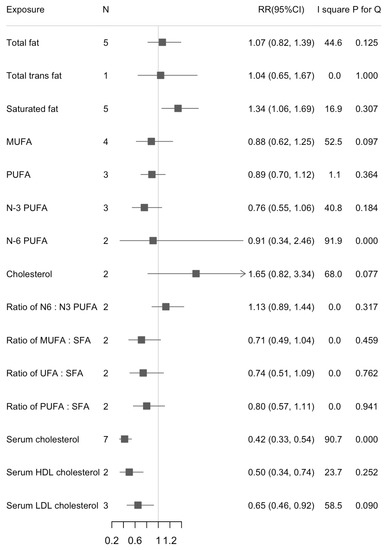 The liver is the main organ for the synthesis and circulation of fatty acids and cholesterol in the human body. The relationship between dietary fat intake and liver cancer risk has been long of interest to researchers. Experimental and animal studies from the last several decades have demonstrated that high-fat diets can increase the risk of steatohepatitis and liver cancer in mice via the accumulation of fat and cholesterol [5]. However, limited prospective studies investigated the associations between dietary fat and liver cancer risk and reported inconsistent results [6,7,8]. In addition, any influence on the development of liver cancer may depend on the types of fatty acids. Due to the lower power of individual studies with a limited number of liver cancer cases, combining all the available evidence using meta-analysis methods will enhance the power to detect significant associations with liver cancer not only for dietary fats but also for different types of fatty acids.