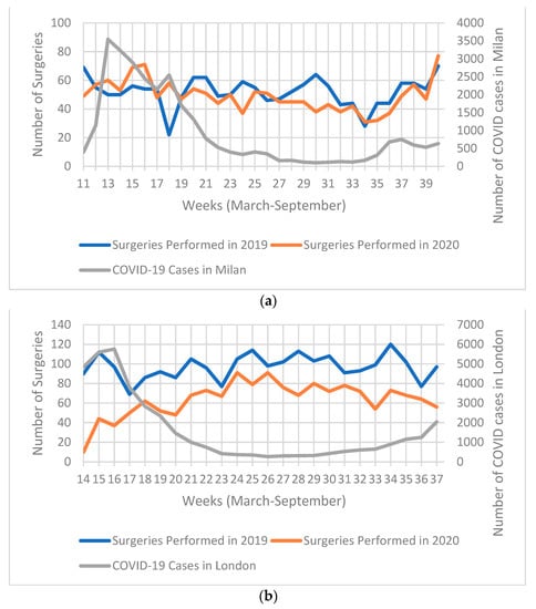 Chart illustrating: (a) weekly COVID-19 cases in Milan (and metropolitan area), and number of surgeries 1 March 2020–30 September 2020; (b) weekly SARS-CoV-2 (COVID-19) cases in London (and metropolitan area), and number of surgeries performed in South East London Cancer Alliance (SELCA) between 23 March 2019–8 September 2019 and 23 March 2020–8 September 2020.