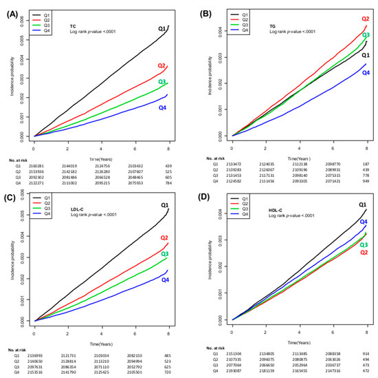 Cumulative incidence of HCC according to the quartiles of TC (A), TG (B), LDL-C (C), and HDL-C (D). HCC, hepatocellular carcinoma; TC, total cholesterol; TG, triglycerides; LDL-C, low-density lipoprotein cholesterol; HDL-C, high-density lipoprotein cholesterol.