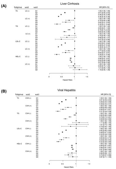 Adjusted HRs of HCC incidence according to lipid profile classification stratified by the presence of LC (A) or VH (B). HR, hazard ratio; HCC, hepatocellular carcinoma; LC, liver cirrhosis; VH, viral hepatitis.