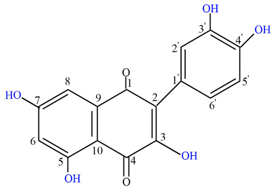 Polyphenol quercetin is an abundant natural flavonoid found in medicinal plants, leaves, vegetables, and fruits. The daily recommended intake of quercetin is 15 mg and it is also recommended as a dietary supplement [9,10]. Quercetin belongs to the flavone class and its structure is characterized by the 5-OH group at the 3, 3′, 4′, 5, and 7 positions (Figure 1) [11]. Quercetin is soluble in organic solvents, but insoluble in water. This hydrophobicity makes it unsuitable for the pharma industry. Many highly advanced techniques have been attempted to crack this barrier including microemulsions, polymeric nanoparticles, solid lipid nanoparticles, liquid crystal systems, liposomes, and precursor systems for quercetin [12,13].