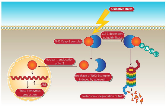 In the treatment of ARE-mediated inducer cells, quercetin facilitates the detachment of the Nrf2-Keap1 complex, resulting in the translocation of Nrf2 to the nucleus, where it composes heterodimers with other transcription factors, binds to ARE, and activates phase II enzyme gene transcription [124]. The molecular target pathway is shown in Figure 4.