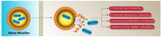 To cope with the hydrophobicity and poor bioavailability of quercetin in castration resistant prostate cancer, Zhao et al. conducted in vitro and in vivo studies by encapsulating quercetin in nano micelles. An encapsulation of 1 mg/mL efficiently enhanced the water solubility of quercetin 450-fold. The invitro studies showed that the half maximum inhibitory concentration for micellar quercetin formulation was 20 µM, compared to 200 µM of free quercetin. Thus, the nano based formulation efficiently induced apoptosis and inhibited proliferation in human androgen prostate cancer cell lines. In addition, quercetin loaded micelles in vivo displayed superior antitumor efficacy, and proliferation rate decreased by 52.03 percent relative to the control group in the PC-3 xenograft mouse model, likely due to enhanced accumulation of micellar quercetin at the tumor site through enhanced permeability and retention effects [149]. The nano micelle-based drug delivery system forms a promising and successful pharmaceutical treatment approach for prostate cancer (Figure 7).
