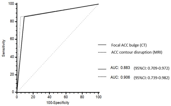 No differences in AUROC were found between focal ACC bulge on CT (0.883; 95% CI: 0.709–0.972) and ACC contour disruption on MRI (0.906; 95% CI: 0.739–0.982) (p = 0.838) (Figure 5).