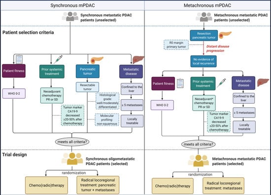 It should be emphasized that the potential survival benefit of additional locoregional treatments solely applies to a highly selected group of mPDAC patients, thus making proper patient selection a crucial element. Based on the presented results as well as previous discussions [83,84], this is particularly true for patients with hepatic mPDAC, since a potential survival benefit is uncertain, but risk of procedure-related morbidity and mortality is high. Although patients with pulmonary mPDAC should also be selected carefully, local treatment seems more justified, with a more apparent survival benefit and fewer complications. Prognostic factors (Table 2) presented in the analyzed studies give an insight into which patient and tumor characteristics can be utilized for this selection. Based on this information, we have constructed two possible setups of RCTs for patients with synchronous or metachronous mPDAC who, upon meeting all selection criteria, can be randomized into either the radical locoregional treatment group or control group (CRT) (Figure 2). The included criteria are discussed below.