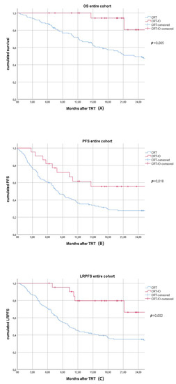 Progression-free survival (PFS) was defined as the time from end of TRT until disease progression or death. Similarly, overall survival (OS), local-regional-progression-free-survival (LRPFS), and time-to-LRR (TLRR) were assessed from the end of TRT.