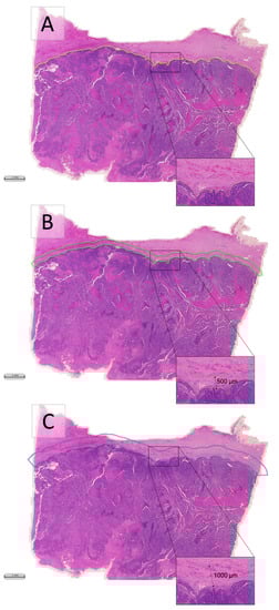 Desmoplastic reaction regions of interest. (A) Annotated tumour front, shown in yellow; (B) Desmoplastic reaction Margin 1 shown in green, being a 500 μm border from the invasive front; and (C) Desmoplastic reaction Margin 2 shown in blue, being a 1000 μm border from the invasive front.