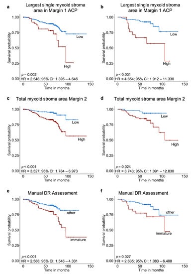 Kaplan–Meier survival analysis for the largest single myxoid stroma area in Margin 1 ACP, total myxoid stroma area Margin 2, and manual DR Assessment for the training and test sets. (a) Largest single myxoid stroma area in Margin 1 ACP for the training set, (b) largest single myxoid stroma area in Margin 1 ACP for the test set, (c) total myxoid stroma area Margin 2 for the training set, (d) total myxoid stroma area Margin 2 for the test set, (e) manual DR Assessment for the training set, and (f) manual DR Assessment for the test set. p values from KM analysis. HR and CI from univariate Cox regression analysis.