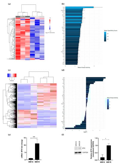 To investigate whether the observed TK hyperactivation is also reflected at the transcriptome level, RNA sequencing analysis of basal gene expression in MM1S and MM1R cells was conducted. Results were analyzed with the R-package DESeq2 [57], using a selection criterion of a minimal FDR < 0.01. Upon comparing gene expression patterns in both cell lines, 1383 differentially expressed genes (DEG) (logFC > 1 or logFC < −1) could be identified (Figure 1c). Interestingly, from all hyperactivated TK in MM1R cells listed before, BTK was identified as the strongest upregulated TK in GC-resistant MM1R cells (Figure 1d, is included in the top 20 most significant DEG (Table 1). Upregulation of BTK in MM1R cells was validated by qPCR and Western blot analysis (Figure 1e–f) and is in line with previous observations [17,58]. Taken together, these findings suggest that BCR signaling and BTK in MM1R cells may represent an attractive target to kill GC-resistant MM1R cells.