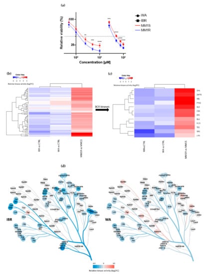 (a) Relative cell viability of MM1 cells upon 24 h exposure to increasing concentrations of BTK inhibitor ibrutinib (IBR) or withaferin A (WA). Data are plotted as the mean ± s.d., n = 3 biologically independent replicates. (** p < 0.01, *** p < 0.001 **** p < 0.0001, ANOVA). (b) Heatmap representation of hyperactivated or inhibited kinases in MM1R versus MM1S cells, or following 15 min IBR or WA treatment, n = 3 biologically independent replicates per treatment group. (c) Close-up heatmap representation of Figure 2b showing inhibited BCR-related kinases in MM1R versus MM1S or following 15 min IBR or WA treatment, n = 3 biologically independent replicates per treatment group. (d) Kinase trees displaying the tyrosine kinase targets of IBR (left) and WA (right). Kinase trees were generated with the CORAL web tool (http://phanstiel-lab.med.unc.edu/CORAL/, accessed on 30 November 2020).