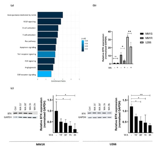 (a) Panther pathway enrichment analysis of significant (FDR < 0.05) differentially expressed genes of WA-treated MM1R cells as determined by RNA sequencing. (b) Relative BTK mRNA levels of MM1R, MM1S and U266 cells treated with WA for 3 h. Data are plotted as the mean ± s.d., n = 3 biologically independent replicates (* p = 0.0453, ** p = 0.0015, ANOVA) (c) Western blot detection and quantification of BTK and GAPDH expression levels after WA treatment in MM1R and U266 cells. Data are plotted as the mean ± s.d., n = 3 biologically independent replicates. (* p < 0.05, ** p < 0.01, ANOVA).