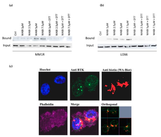 Since WA contains several reactive nucleophilic groups, which can covalently bind to kinase sulfhydryl groups of cysteines through Michael addition [48,63,64], we also evaluated the potential covalent binding of WA to BTK by pulldown experiments with biotinylated WA (WABI). Pull-down experiments with WABI in MM1R cells indeed confirmed cysteine-dependent binding to BTK, which can be blocked by excess amounts (1 mM) of the reducing agent dithiothreitol (DTT) (Figure 4a). Along the same line, covalent WA-BTK interaction could be confirmed in U266 cells (Figure 4b). The biological relevance of this covalent interaction could further be validated in washout experiments where MM1R cells were exposed to increasing concentrations of WA for 15 min, after which it was washed away with PBS. Although WA cells were only briefly treated with WA, the cell viability of MM1R cells was still affected in a dose-dependent manner 24 h post-treatment (Supplementary Figure S7). The growth inhibition remains the strongest in the unwashed cells, suggesting the contribution of non-covalent interactions of WA as well. H-bond and van der Waals interactions between WA and target molecules, such as Hsp90, have indeed been reported to contribute to the anticancer mechanism of WA [65]. Alternatively, covalent binding by WA may be weaker than a normal covalent binding and become reversed by washout experiments [66,67,68]. Finally, by confocal microscopy, we could also demonstrate colocalization of BTK and WABI in MM1R cells (Figure 4c).