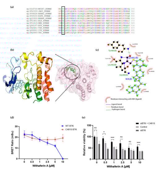 (a) Multiple sequence alignment of Hinge 6 domain-type kinases. The conserved GC-motif between different orthologs is indicated. Alignment was performed with Clustal Omega (https://www.ebi.ac.uk/Tools/msa/clustalo/ accessed on 30 November 2020). (b) Crystal structure of BTK (PBD id: 6TFP) in complex with WA (PubChem CID: 26537) covalently bound to Cys481. (c) Interaction between WA and BTK structure visualized using Ligplot [74], showing the covalent bond formation of the C4-OH group of WA with the SH group of Cys481 from BTK. (d) Inhibition of wild-type (WT) BTK and mutated (C481S) BTK by WA in HEK-293 cells. Data are plotted as mean ± s.d., n = 3 biologically independent replicates. (e) Relative viability of MM1R cells treated for 24 h with increasing concentrations of WA, upon BTK silencing (siBTK) in presence or absence of C481S BTK overexpression. Data are plotted as mean ± s.d., n = 3 biologically independent replicates (ns = p > 0.05, * p = 0.0309, *** p < 0.0001, ANOVA).