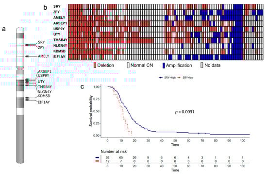 The ddPCR was used to test for copy number (CN) changes on chromosome Y, using 10 markers spread throughout both arms (a). We obtained CN results for all markers in 94 samples, detecting deletions (red; cut-off value 0.8), as well as amplifications (blue; cut-off value 1.2) (b). By applying maximally selected rank statistics analysis to the CN results (Supplementary Materials, Figure S1), we were able to choose the best deletion cut-off values, associated with shorter OS. Deletions of SRY (c) had significant association with shorter OS (10.8 vs. 14.8 months). For 11 samples results were not obtained for one or more genes.