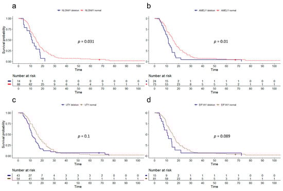 The log-rank Kaplan–Meier survival curves for genes (a) NLGN4Y (10.8 vs. 14.5 months, p = 0.031), (b) AMELY (11.5 vs. 15.2 months, p = 0.01), (c) UTY (11.5 vs. 15.3 months, p = 0.1), and (d) EIF1AY (10.8 vs. 15.1 months, p = 0.089) after re-analysis with the ddPCR CN cut-off value of 0.8.