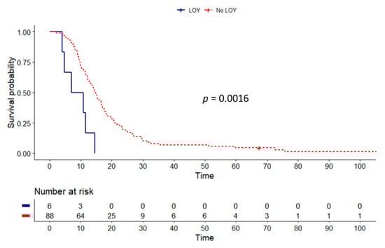 Then, we undertook survival analysis for individuals with a complete LOY. Indeed, these patients had significantly shorter OS (7 vs. 14.5 months, p = 0.002) (Figure 3); however, there were only six tumors with complete LOY (Figure 1b). No significant influence of deletion of the reported 3-gene cluster (ARSEP1, TMSB4Y, and UTY) on OS was observed (p > 0.05).