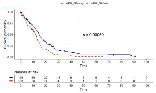 The TCGA cohort was examined similarly to the Swedish cohort, however the relative mRNA expression data of each gene was used as a proxy for CN aberrations. The best cut-off values, creating the largest differences in OS between low and high expression groups, were chosen through maximally selected rank statistics. We could analyze nine genes, as no mRNA expression data were available for the pseudogene ARSEP1, as expected. Out of the nine genes, six showed significant correlation of reduced mRNA expression to survival, while three (ZFY, KDM5D, and EIF1AY) did not reach statistical significance. The highest significance was noted for SRY, similarly to the CN analysis in the Swedish cohort. Patients with low expression of SRY (lower or equal to 3.3867(log2)) had shorter OS in comparison to the high expression group (11.9 vs. 14.7 months, p = 0.00069) (Figure 4). Significantly shorter OS associated with lower mRNA expression was also found for TMSB4Y (12.6 vs. 15.8 months, p = 0.0023), AMELY (12.7 vs. 14.2 months, p = 0.0087), and UTY (12.7 vs. 18.5 months, p = 0.0031). Surprisingly, in two cases low expression correlated with longer survival (USP9Y (14.1 vs.12.6 months, p = 0.039) and NLGN4Y (12.9 vs. 12.7 months, p = 0.039) (Supplementary Materials, Figure S2).