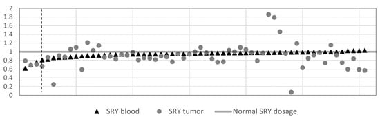 Known chromosomal aberrations in tumors, as well as published research about Y chromosome loss in aging men, led to our finding regarding the impact of loss of SRY. This encouraged us to further study the nature of SRY deletions. Interestingly, the Mann–Whitney U tests did not show any significant age difference between males with the SRY deletion (mean age 56.8 years) and normal or elevated SRY CN (mean age 57.4 years), nor in TCGA group of patients with low (mean age 61.9 years) or high SRY expression (mean age 61.6 years). Additional CN analysis of SRY in the 61 tumor matched blood samples (Figure 5) revealed that only three tumor–blood pairs had deletions (CN ≤0.8) in both, indicating that SRY deletions are mainly tumor private.
