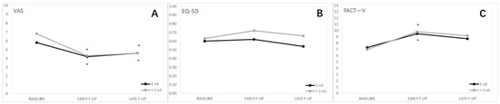 Quality of life by type of response. (A) Visual analog pain scale (VAS); (B) Functional Assessment of Cancer Therapy—Vulva cancer (FACT-V); (C) EuroQol 5-Dimension 5-Level (EQ-5D-5LQuality of life improved after ECT treatment if we consider the VAS and FACT-V scores, while no significant differences were observed between the three groups at baseline or at each follow-up for EQ-5D-5L scores *.