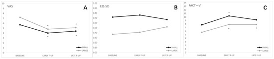 Regarding the EQ-5L-5D scores, there was a significant difference between the groups throughout the timepoints, starting from the baseline up to the late follow-up, with significantly higher scores for large lesions. No significant differences were observed between the baseline and follow-up values within each group (Table 3).