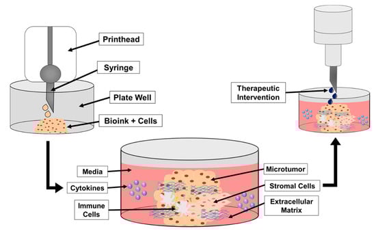 The bioink that is best suited for the specific model that is being researched will possess the desired physiochemical properties of the tissue in question, including chemical and biological characteristics [116]. For example, successful bioprinted models of breast and pancreatic cancer were created using a reversibly cross-linkable hydrogel bioink, composed of 1% Pronova Ultrapure Low Viscosity Sodium Alginate and 6% gelatin in phosphate buffered saline (PBS). Fibroblasts, endothelial cells, additional stromal cells, and growth factors were also used in these models to help create the physiochemical properties of the cancer in question. This group further demonstrated that multi-cell-type bioprinted tissues were able to recapitulate the TME of in vivo neoplastic tissues [117].