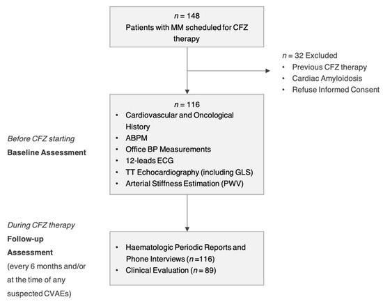 This cohort prospective study was conducted at the third level Hypertension Unit and Centre for Cardiovascular diseases of ‘Città della Salute e della Scienza’ Hospital in Turin, Italy. Patients with MM who had indication for CFZ were consecutively enrolled between January 2015 and March 2020. Patients previously treated with CFZ, those affected by light chain cardiac amyloidosis (assessed by end-organ biopsy or cardiac magnetic resonance imaging) and those refusing informed consent were excluded.
