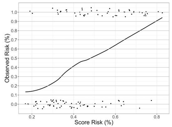 Smooth Calibration plot for the validation of CFZ CVAEs Risk Score. Comparison between observed and predicted CVAEs based on bootstrap. The grey line represents the perfect condition in which the observed CVAEs are equal to predicted CVAEs; the black line represents the CVAEs observed in our population.