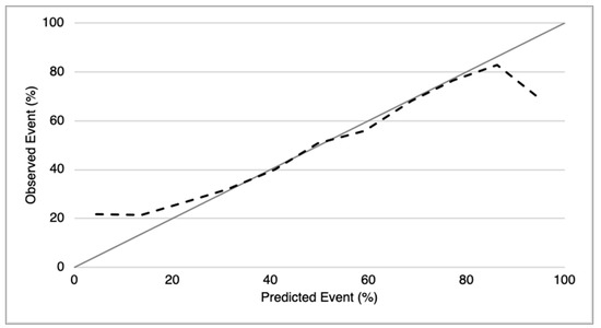 The CFZ CVAEs Risk Score was developed according to the CHARMS Recommendations [15] and adheres to the TRIPOD Statement for Prediction Model [16]. The analysis was performed using a dedicated software (R: A Language and Environment for Statistical Computing, v.4.0.0 for Mac OSX, R Core Team, Vienna, Austria). Missing data (3.8% of the 1276 total variables) were estimated by multiple imputations system as recommended [15,17]. Regression analysis was performed by two penalized models: the first, with the aim of reducing the set of covariates [18], and the second with the aim of building a risk predictor system, the ‘CFZ CVAEs risk score’. The score was internally validated by bootstrapping according to the CHARMS Recommendations [15]: 1000 random samplings with replacement from the original sample were performed in order to assess the discrimination and the calibration of the score. Discrimination was calculated with C statistic, and calibration was assessed using the calibration plot and the calibration slope. The optimal threshold was identified by imposing a sensibility value ≥ 90%.