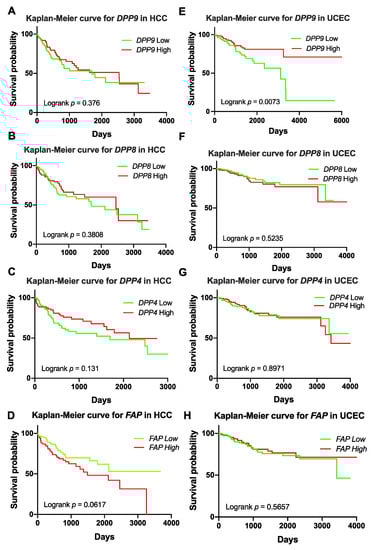 Kaplan-Meier curves for DPP9, DPP8, DPP4 and FAP in liver tumors (hepatocellular carcinoma, HCC; (A–D)) (n = 360) and uterine corpus endometrial carcinoma (UCEC; (E–H)) (n = 540). High or low was defined as the mRNA expression values in the upper or lower quartile, respectively. p values were calculated by logrank (Mantel-Cox) test.