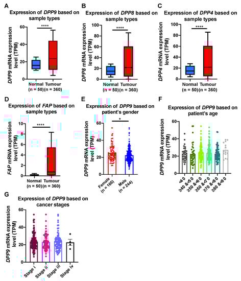 The relative mRNA expression level of DPP9, DPP8, DPP4 and FAP in liver tumors (A–D) and association of DPP9 expression with gender (E), age (F) and cancer stages (G) in HCC patients. p values were calculated by Mann-Whitney U test (A–E) and Kruskal-Wallis one-way analysis of variance with Tukey’s post-hoc test (F,G). * p < 0.05, **** p < 0.0001.