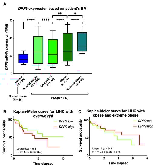 The relative mRNA expression and survival analysis of DPP9 in HCC based on patient BMI. (A) The mRNA expression of DPP9 based on HCC patient (n = 360) BMI compared to non-diseased subjects. p values were calculated by Kruskal-Wallis one-way analysis of variance with Tukey’s post-hoc test, with * p < 0.05, ** p < 0.01, **** p < 0.0001. (B) Kaplan-Meier curve for DPP9 expression in overweight HCC patients. (C) Kaplan-Meier curve for DPP9 expression in obese and extreme obese HCC patients. The high (red) and low (green) mRNA expression levels of genes in liver tumors were stratified based on median expression value. p values and hazard ratio (HR) with confidence interval were calculated by logrank (Mantel-Cox) test.