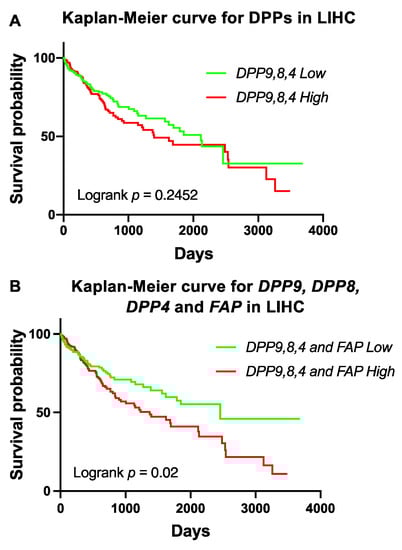 To further investigate DPP4 gene family expression in liver cancer prognosis, we stratified DPP9, DPP8 and DPP4 based on median expression in HCC. High co-expression of DPP9, DPP8 and DPP4 was not associated with OS (Figure 4A). However, high co-expression of DPP9, DPP8, DPP4 and FAP in the liver tumor was significantly associated with poor survival in HCC patients (Figure 4B). This data strengthens evidence that FAP might contribute to poor outcomes, possibly due to its role in liver cirrhosis and steatosis, which is strongly associated with poor liver function and liver cancer [50,51].