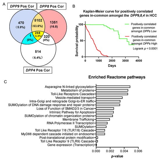 Survival analysis and enriched reactome pathways analysis on genes that were positively correlated with DPP9, DPP8 and DPP4. (A) Venn diagram of the gens that were positively correlated with DPP9, DPP8 and DPP4. The gene in the blue section is TPRA1. “Pos Cor” refers to positive correlation. (B) Kaplan-Meier curve for the 268 genes that were positively correlated and in-common amongst DPP9, DPP8 and DPP4 in HCC patients (n = 360). The high (red) and low (green) mRNA expression levels of genes in liver tumors were stratified based on median expression value. p values were calculated by logrank (Mantel-Cox) test. (C) Enriched reactome pathways of genes that were positively correlated in-common amongst DPP9, DPP8 and DPP4.