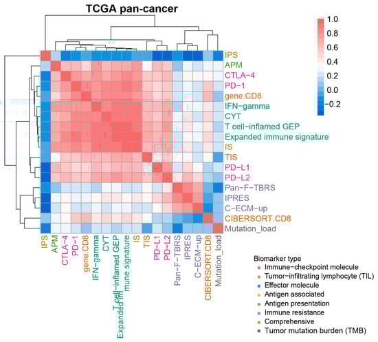 Correlations of transcriptomic biomarkers with ICB response at overall evaluation level. A heatmap displayed the Spearman rank correlation coefficient between any two biomarkers, and demonstrated the hierarchical clustering pattern of various biomarkers based on ~6600 samples from the TCGA pan-cancer cohort. Positive and negative correlations were represented in red and blue, respectively. Biomarkers such as EMT, CRMA, IRP, TIDE and IMPRES were excluded due to them only apply to specific cancer types.