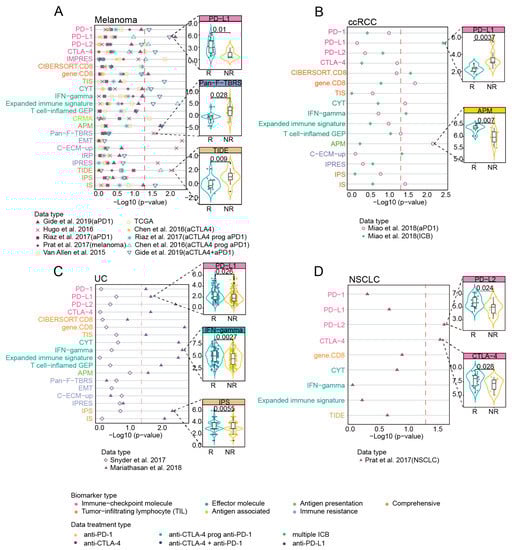 Correlation of biomarkers with clinical response to ICB across multiple datasets with different cancer types. (A–D) Left: the two-sided Wilcoxon rank-sum test p value indicating whether biomarkers significantly differentiate between responders versus non-responders (NR) (patients stratification using “PD” strategy) in distinct tumors, red dashed line indicated 0.05 threshold of p value. The color of the dot represented ICB treatment types of each dataset. Magenta denoted anti-PD-1, yellow denoted anti-CTLA-4, light green denoted “anti-PD-1 after progression on prior anti-CTLA-4”, blue represented combined anti-PD-1 and anti-CTLA-4 immunotherapy, grass green represented multiple ICB treatments, and purple represented anti-PD-L1. Right: boxplots showing examples of biomarkers with significant difference (Wilcoxon rank-sum test p < 0.05) between the responding (R) versus non-responding (NR) tumors. Black lines in the box represented upper 75%, median, and lower 25% values.