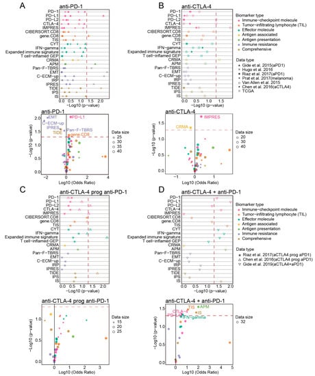 Furthermore, we evaluated the performance of response biomarkers under different ICB therapy strategies. Due to the limited availability of sufficient datasets from other cancer types to cover multiple treatment strategies, we only split melanoma patients according to treatment strategies. For anti-PD-1 immunotherapy, immune checkpoint PD-L1, gene.CD8, the biomarkers Pan−F−TBRS, C-ECM-up in “Immune resistance” category and TIDE presented significant association with clinical response and prognostic efficiency. While under the anti-CTLA-4 therapy, our analysis revealed CTLA-4 and IMPRES, TIS, CRMA, and IPS performed better than other biomarkers for predicting treatment response. Interestingly, the top-performing transcriptomic biomarkers under PD-1 blockade couldn’t perform well as those in anti-CTLA-4 therapy and vice versa. These findings were supported by previous studies showing that the CTLA-4 pathway and PD-1 pathway executed non-redundant co-inhibitory roles [51]. For “anti-CTLA-4 prog anti-PD-1” therapy, the biomarkers PD-L2, Expanded immune signature and TIDE showed consistently better performance than the others. Comparing with monotherapies and sequential therapy, more transcriptomic biomarkers were found to be correlated with clinical response, predictive power and prognostic efficacy in patients following combined anti-CTLA-4 and anti-PD-1 therapy [65,66]. Targeting both of the immunosuppressive pathways simultaneously, combination therapy could more effectively, at least in part, induce the infiltration of immune cells, production of inflammatory cytokines and enhancement of tumor antigen presentation [52]. Correspondingly, these notions were consistent with our observations that these immunobiologic process-related biomarkers TIS, IFN−gamma and APM all exhibited significant association with clinical response and achieved better accuracy in combination therapy cohorts.