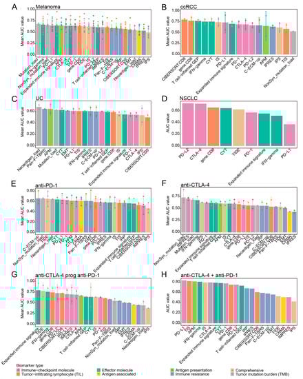 Prediction performance of biomarkers for ICB response across different cancer types and different ICB therapy strategies. (A–D) Bar centre was defined by the mean AUC values of each transcriptomic biomarker across different cancer datasets (patients stratification using “PD” strategy), and error bars indicated ±1 SD. (E–H) Bar centre was defined by the mean AUC values of each transcriptomic biomarker in melanoma datasets under different ICB therapy strategies (patients stratification using “PD” strategy), and error bars indicated ±1 SD.