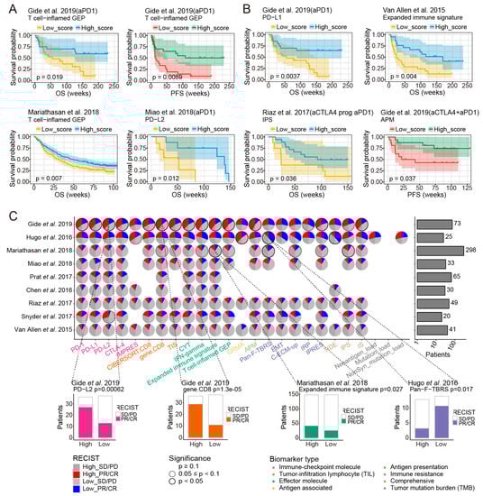 The impact of ICB response biomarkers on clinical efficacy of ICB therapy. Kaplan–Meier survival curves showing OS or PFS for patients with high versus low scores of (A) T cell-inflamed GEP in melanoma, T cell−inflamed GEP in UC and PD−L2 in ccRCC. Kaplan-Meier survival curves showing OS for patients with high versus low scores of (B) PD−L1 under anti-PD-1 therapy, Expanded immune signature under anti-CTLA-4 therapy and IPS under “anti-CTLA-4 prog anti-PD-1” therapy. Kaplan–Meier survival curves showing PFS for patients with high versus low scores of APM under the combination anti-PD-1 and anti-CTLA-4 therapy. (C) Top: the pies on the left panel showing the significance of association for each response biomarker in each overall benchmark dataset and the barplots on the right panel showing the numbers of patients in each dataset. The left half of the pie chart represented the patients with high scores of the corresponding biomarkers, red and dark gray indicated the proportion of responders and non-responders in high-score patients, respectively. The right half of the pie chart represented the patients with low scores of the corresponding biomarkers, blue and light gray indicated the proportion of responders and non-responders in patients with low-score patients, respectively. Borders with no color, gray borders and black borders represented p ≥ 0.1, 0.05 ≤ p < 0.1, p < 0.05, respectively. Different categories of biomarkers were represented by different colors. Bottom: objective response in patients with high versus low scores of PD-L2 and gene.CD8 in the Gide et al., 2019 dataset, Expanded immune signature in the Mariathasan et al., 2018 dataset and Pan−F−TBRS in the Hugo et al., 2016 dataset. Proportion of PR/CR were colored on histograms based on the categories of corresponding biomarkers, with the numbers of patients shown in each bar. Datasets with less than 20 samples were excluded from the analysis.